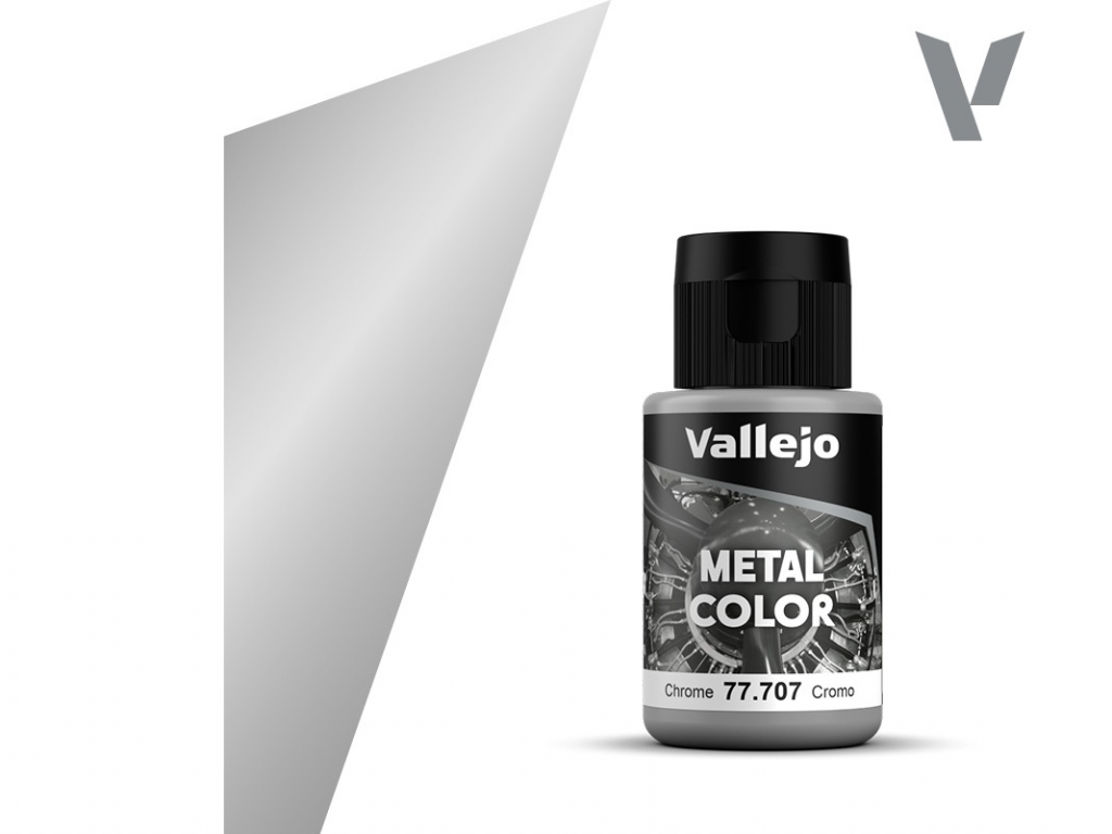 Vallejo Metal Color Chrome, арт. 77.707 — новая формула акриловых металликов на водной основе для покраски моделей аэрографом, цвет — хром. Чаще всего используется при росписи авиационной техники, но также находит применение и в других сферах, а не только моделизме. Например, в интерьерных работах или при покраске макетов. Поскольку это металлик, то перед распылением из сопла диаметром менее 0,3 мм желательно использовать фирменный разбавитель. Жидкая формула разработана специально для целей покраски воздушной кистью. Краска нетоксична, практически не имеет запаха, подходит для работы в домашних условиях. Производится компанией Acrylicos Vallejo, S.L. в Барселоне, Испания.