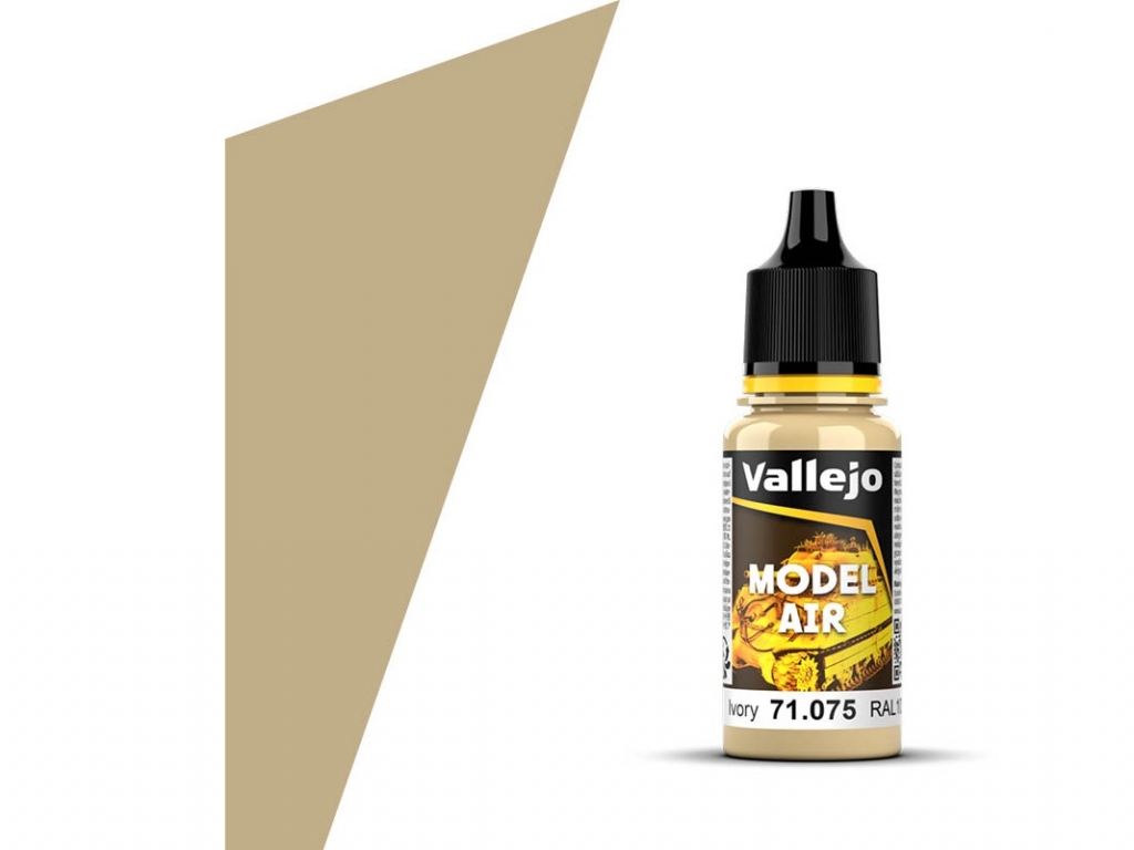 Vallejo Model Air Ivory, арт. 71.075 (RAL1001) — акриловая краска на водной основе для росписи моделей, цвет — слоновая кость. Жидкая формула разработана специально для целей покраски воздушной кистью даже с маленьким соплом. Нетоксична, практически не имеет запаха, подходит для работы в домашних условиях. Производится компанией Acrylicos Vallejo, S.L. в Барселоне, Испания.