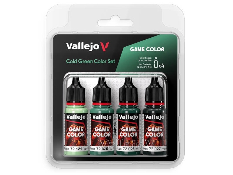 Vallejo Cold Green Color Set, арт. 72.383 — мининабор акриловых красок на водной основе, позволяющий получить разные оттенки холодного зелёного цвета. Состоит он из 4-х цветов линейки Game Color. Если хотите использовать эти краски с аэрографом, то нужно добавить фирменный разбавитель Vallejo Airbrush Thinner. Краска нетоксична, практически не имеет запаха, подходит для работы в домашних условиях. Производится компанией Acrylicos Vallejo, S.L. в Барселоне, Испания.