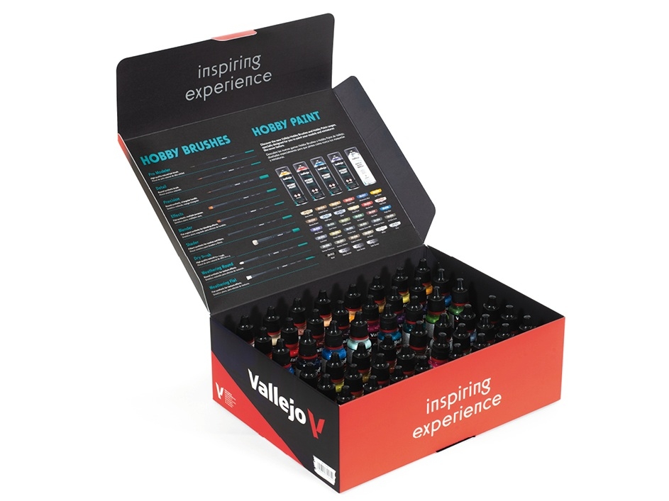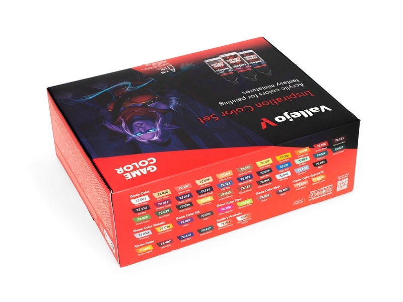 Vallejo Inspiration Color Set, арт. 72.182 — продвинутый набор из 48-ми материалов на водной основе и 3-х синтетических кистей для покраски миниатюр и террейнов. Формула материалов Game Color создана специально для покраски кистью, однако при разбавлении Vallejo Airbrush Thinner их можно использовать и с аэрографом. Краска нетоксична, практически не имеет запаха, подходит для работы в домашних условиях. Производится компанией Acrylicos Vallejo, S.L. в Барселоне, Испания.