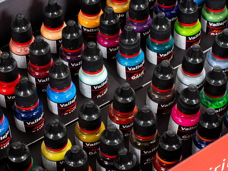 Используются цвета из впечатляющего набора Vallejo Inspiration Color Set 72.182 для покраски миниатюр. Здесь вы найдёте 32 базовых матовых и укрывистых цвета Game Color, 2 цвета металлика из линейки Game Color Metallic, 2 высокопигментированных инка для лессировки и теней из линейки Game Color Ink, 2 проливки для работы над объёмом из линейки Game Color Wash, 2 ярких флуоресцентных цвета для эффектов свечения из линейки Game Color Fluo, 2 специальных эффекта для имитации следов крови и коррозии металла, 4 растекающихся цвета Xpress Color для быстрого и контрастного нанесения. Набор подойдёт тем, кто хочет сразу купить большой комплект цветов, позволяющих закрыть любые фэнтези-задачи, а также попробовать не только обычные краски, но и специальные эффекты и контрасты. Хороший подарок, поскольку данные цвета универсальны и найдут своё применение у любого поклонника миниатюры. Краски из набора имеют хорошую адгезию к пластиками и металлам, не требуют обязательного применения праймера, хотя и дают лучший результат при работе с грунтовками.