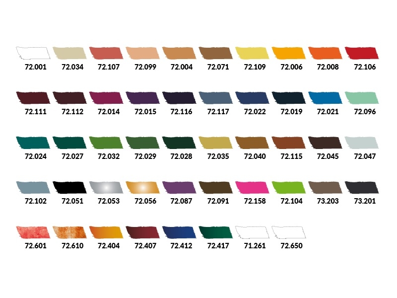 Комплект включает 46 красок по 18 мл: 72.001 Dead White — мёртвенно-белый, 72.034 Bone White — цвет кости, 72.107 Athena Skin — цвет кожи Афины, 72.099 Skin Tone — тёмный телесный, 72.004 Elf Skin Tone — цвет кожи эльфа, 72.071 Barbarian Skin — цвет кожи варвара, 72.109 Toxic Yellow — токсичный жёлтый, 72.006 Sun Yellow — солнечно-жёлтый, 72.008 Orange Fire — огненно-оранжевый, 72.106 Scarlet Blood — цвет алой крови, 72.111 Nocturnal Red — цвет красной ночи, 72.112 Evil Red — цвет красного дьявола, 72.014 Warlord Purple — пурпурный, 72.015 Hexed Lichen — цвет заколдованного лишайника, 72.116 Midnight Purple — тёмно-фиолетовый, 72.117 Elfic Blue — эльфийский синий, 72.022 Ultramarine Blue — синий ультрамарин, 72.019 Night Blue — цвет тёмной синей ночи, 72.021 Magic Blue — магический синий, 72.096 Verdigris — цвет патины, 72.024 Turquoise — бирюзовый, 72.027 Scurvy Green — зелёный бутылочный, 72.032 Scorpy Green — ядовито-зелёный, 72.029 Sick Green — болезненно-зелёный, 72.028 Dark Green — тёмно-зелёный, 72.035 Dead Flesh — цвет мёртвой плоти, 72.040 Leather Brown — цвет коричневой кожи, 72.115 Grunge Brown — коричневый гранж, 72.045 Charred Brown — обгоревший коричневый, 72.047 Wolf Grey — цвет шкуры серого волка, 72.102 Steel Grey — стальной серый , 72.051 Black — чёрный, 72.053 Chainmail — тёмно-серебряный, 72.056 Glorious Gold — цвет тёмного золота, 72.087 Violet Ink — полупрозрачная фиолетовая, 72.091 Sepia Ink — полупрозрачная сепия, 72.158 Fluorescent Magenta — флуоресцентная краска цвета маджента, 72.104 Fluorescent Green — флуоресцентный зелёный, 73.203 Umber Wash — проливка цвета умбра, 73.201 Black Wash — проливка чёрного цвета, 72.601 Fresh Blood — эффект "свежая кровь", 72.610 Galvanic Corrosion — эффект "гальваническая ржавчина", Xpress Color 72.404 Nuclear Yellow — ядерный жёлтый, Xpress Color 72.407 Velvet Red — бархотно-красная, Xpress Color 72.412 Storm Blue — цвет "синий шторм", Xpress Color 72.417 Snake Green — цвет "зелёная змея".