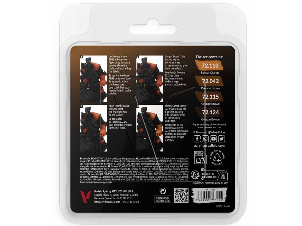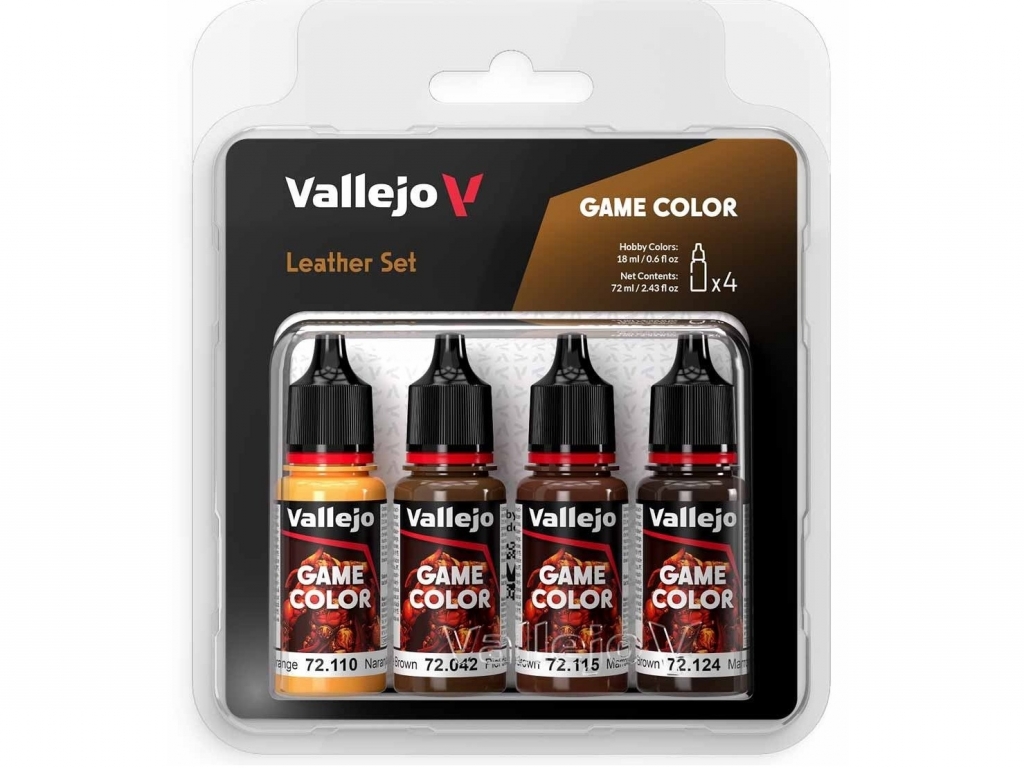 Vallejo Leather Color Set, арт. 72.385 — мининабор акриловых красок на водной основе, позволяющий получить цвета выделанной кожи. Состоит он из 4-х цветов линейки Game Color. Если хотите использовать эти краски с аэрографом, то нужно добавить фирменный разбавитель Vallejo Airbrush Thinner. Краска нетоксична, практически не имеет запаха, подходит для работы в домашних условиях. Производится компанией Acrylicos Vallejo, S.L. в Барселоне, Испания.
