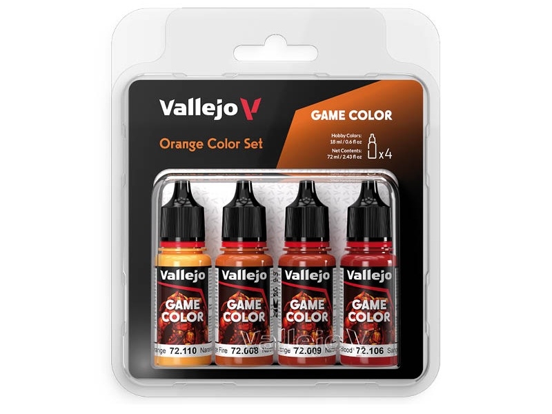 Комплект включает 4 укрывистых цвета Game Color по 18 мл: 72.008 Orange Fire — огненно-оранжевый, 72.009 Hot Orange — ярко-оранжевый, 72.106 Scarlet Blood — цвет алой крови, 72.110 Sunset Orange — цвет оранжевого заката. Один цвет базовый, один для затемнения и два для высветления. Последовательность нанесения цветов представлена на обратной стороне упаковки. Краски помещены в прозрачную упаковку-блистер, которая хорошо подходит для подарка. Обратите внимание, для лучшего эффекта и защиты могут дополнительно потребоваться грунтовки, лаки и технические жидкости.