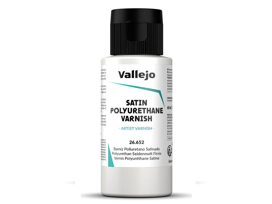 Vallejo Satin Polyurethane Varnish, 26.652 — сатиновый полиуретановый лак на водной основе для лакировки изделия, покрашенного материалами линеек Vallejo Model Air, Game Air, Model Color, Game Color, Panzer Aces, Xpress Color и др. Производится компанией Acrylicos Vallejo, S.L. в Барселоне, Испания. Поставляется в пластиковых флаконах объёмом 60 мл с удобной крышкой флип-топом.